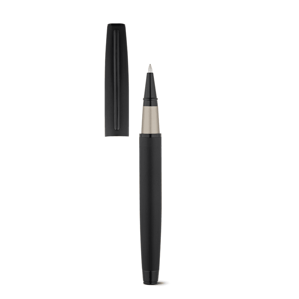 Conjunto de roller e esferográfica em metal, ambos com clipe e escrita a preto. A esferográfica é de mecanismo twist e permite até 1,5 km escrita. Incluso estojo almofadado. ø13 x 136 mm | Estojo: 185 x 75 x 31 mm
