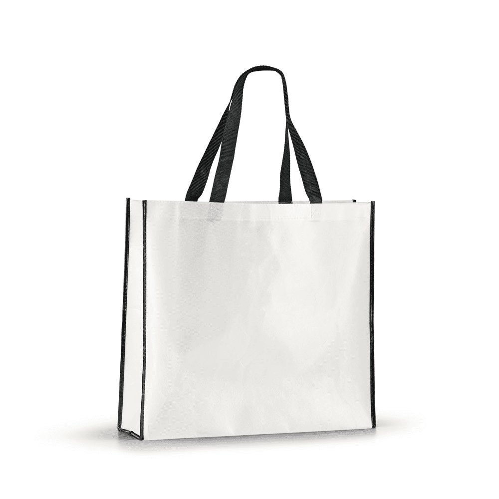 Sacola em non-woven laminado (120 g/m²) com laminação brilhante. Alças em webbing de 60 cm. 420 x 380 x 150 mm