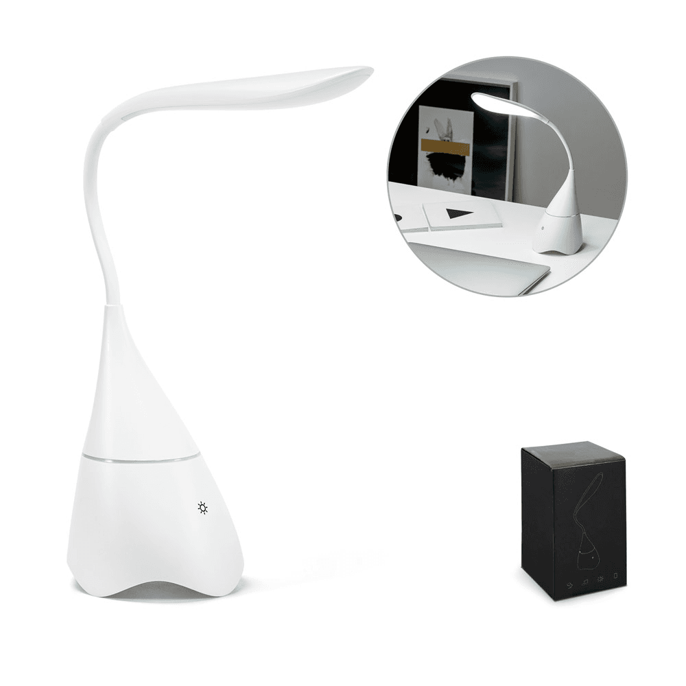 Luminária de mesa com caixa de som em ABS com 18 LEDs de alto brilho, botão tátil e braço flexível. Transmissão sem fios BT v4.2 e ligação stereo 3,5 mm com 5W/4Ω. Autonomia aproximada 6 horas. Permite a conexão à playlist do dispositivo móvel. Incluso cabo USB-C para carregar. Fornecida em caixa presente. 100 x 225 x 100 mm | Caixa: 110 x 235 x 105 mm