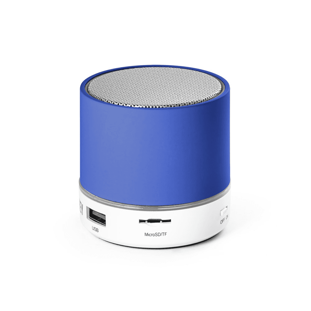 Caixa de som portátil com microfone, em ABS e acabamento emborrachado. Transmissão sem fios BT v3.0 e leitor de cartões TF. Com 3W/4Ω e autonomia aproximada de 2h. Função para atender chamadas, controle de volume e conexão à playlist do dispositivo móvel. Incluso cabo USB / micro USB para carregar. ø59 x 55 mm