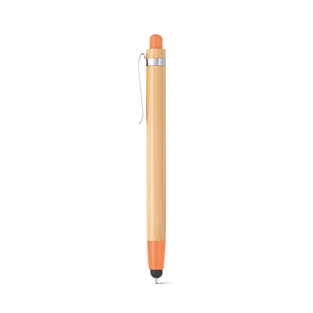 Esferográfica em bambu com ponteira touch e clipe de metal. Os elementos coloridos são em fibra de trigo e ABS. Escrita em azul até 1,5 km. A cor e o resultado da impressão nos materiais naturais pode variar entre produtos. ø11 x 139 mm