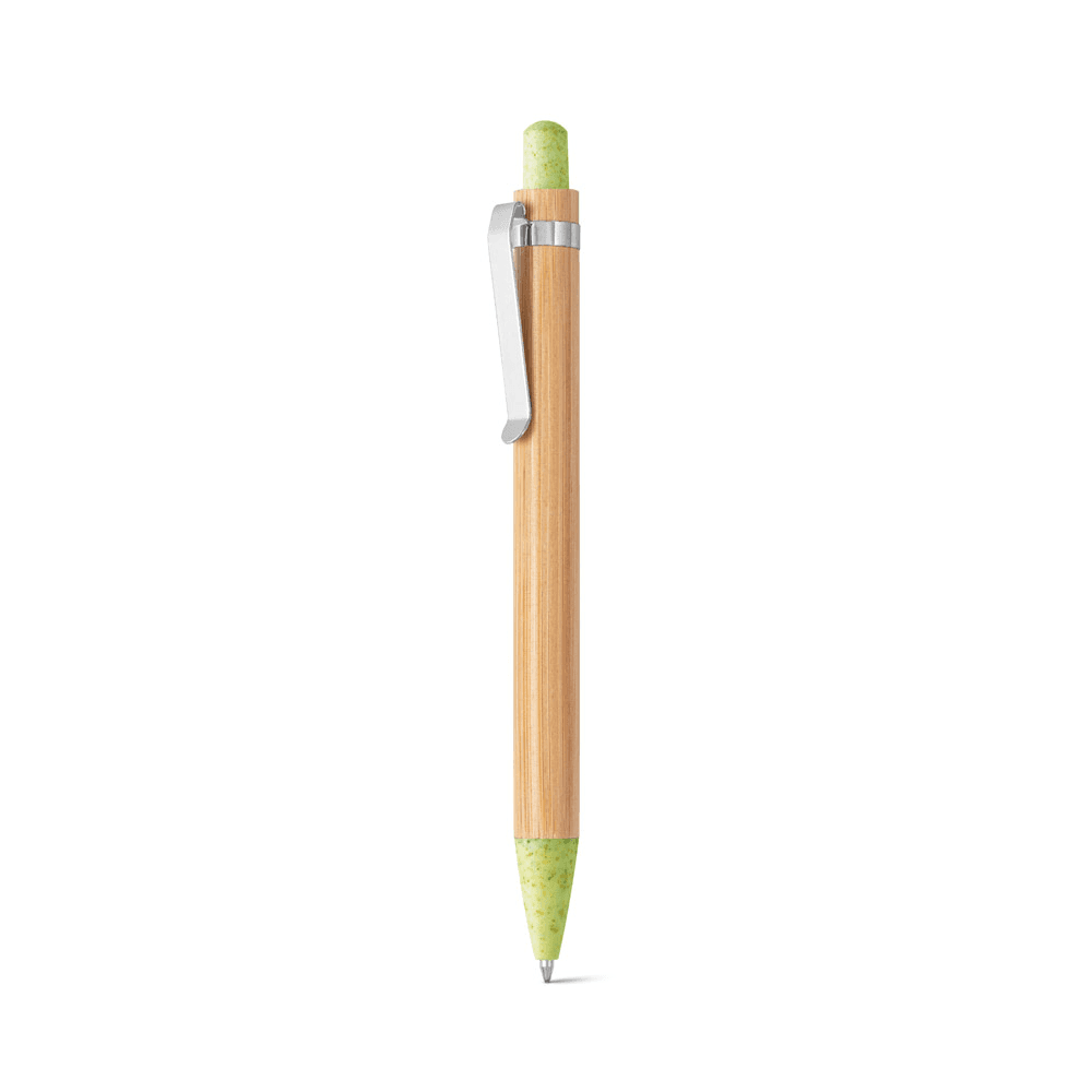Esferográfica em bambu e clipe em metal. Os elementos coloridos são em fibra de trigo e ABS. Escrita em azul até 1,5 km. A cor e o resultado da impressão nos materiais naturais pode variar entre produtos. ø11 x 142 mm