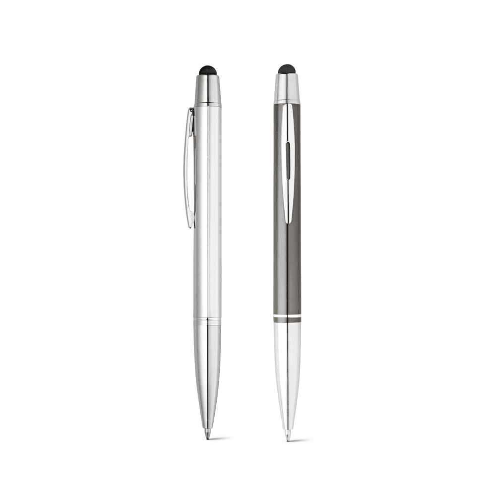 Esferográfica em alumínio com mecanismo twist, ponteira touch e clipe de metal. Escrita em azul até 1,5 km. ø11 x 135 mm