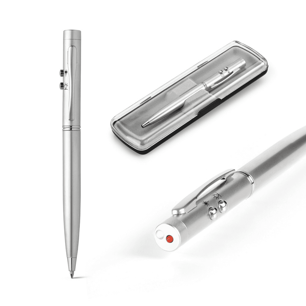 Esferográfica em metal, com ponteira laser e LED. Incluso 3 pilhas LR41. Escrita em azul até 1,5 km. Fornecida em estojo com forro de veludo. ø10 x 131 mm | Estojo: 170 x 50 x 20 mm