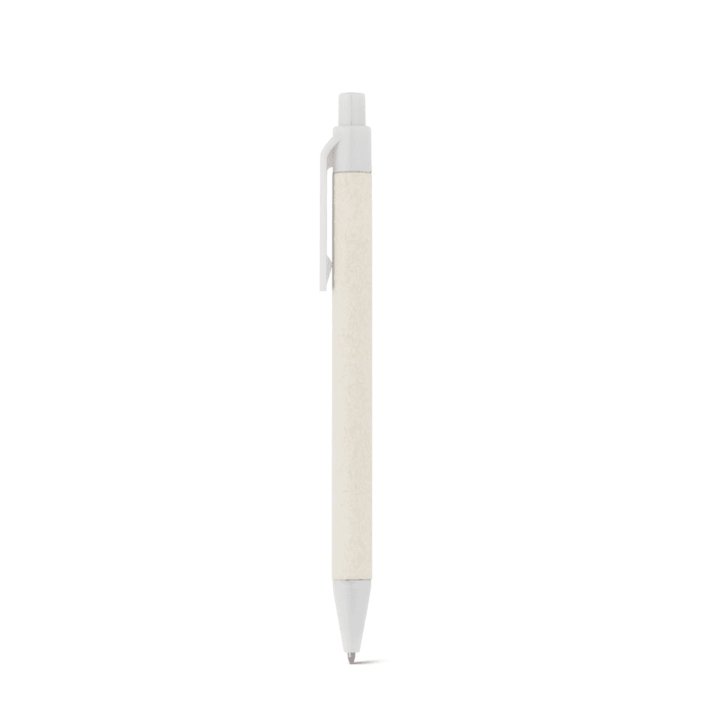 Esferográfica produzida através de pacotes de leite reciclados, contribuindo para o reaproveitamento do cartão e alumínio. Corpo em cartão e componentes coloridos em ABS 100% reciclado. Escrita em azul até 1,5 km. ø10 x 139 mm