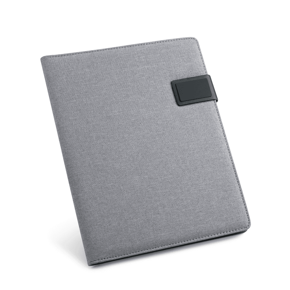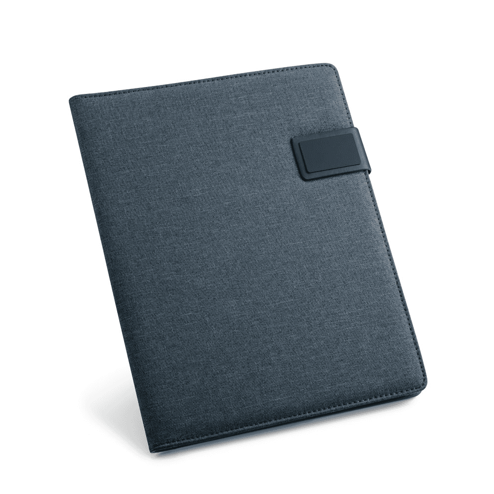 Pasta A4 em linho sintético e c. sintético com fecho magnético. O interior contém um caderno de 40 páginas pautadas, suporte para esferográfica (não inclusa), bolso para smartphone e suportes para cabos ou outros acessórios (não inclusos). Placa metálica com acabamento emborrachado. 233 x 310 x 18 mm | Placa: 50 x 30 mm