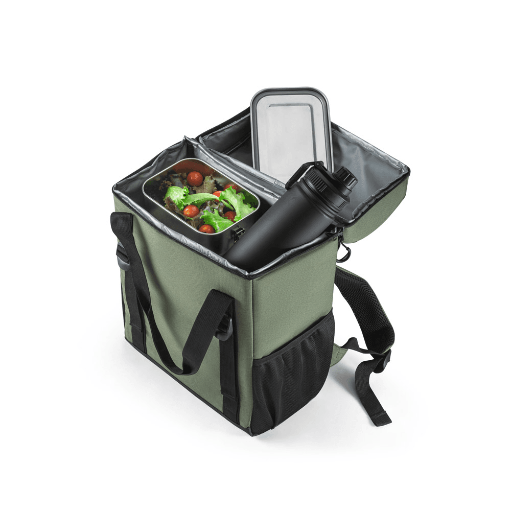Mochila térmica almofadada em ripstop poliéster reciclado 600D. É composta por 2 correias frontais que facilitam no transporte de objetos, 1 compartimento principal espaçoso com fecho duplo, 2 bolsos laterais em tela mesh para pequenos objetos e alças ajustáveis para assegurar um maior conforto no transporte. O interior forrado em PEVA garante um bom isolamento térmico permitindo a conservação do frio por mais tempo e a sua higienização. A robustez dos materiais que a compõe conferem-lhe uma grande resistência e durabilidade, pensado para as necessidades do cotidiano. Capacidade até 16 L. Certificação EU Food Grade. 280 x 400 x 160 mm
