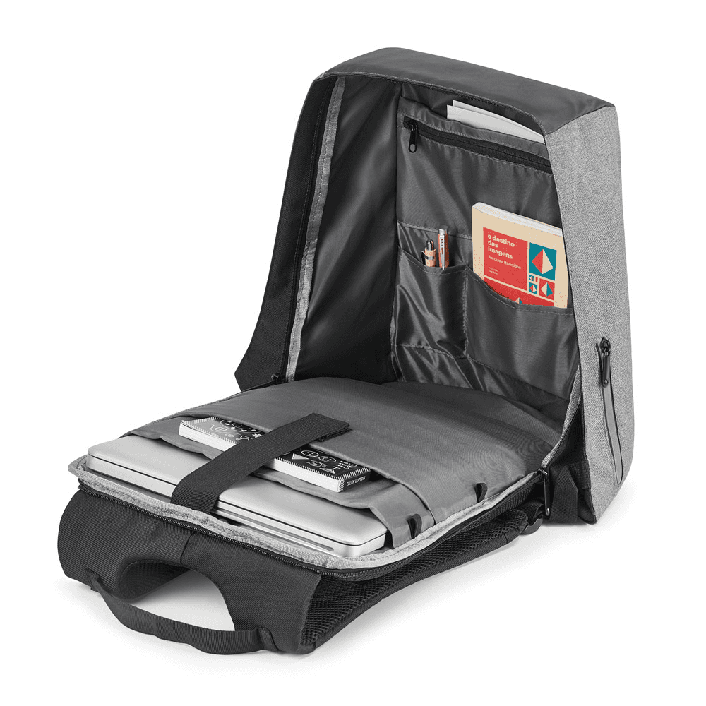 Mochila para notebook em 900D de alta densidade e tarpaulin. Sistema antirroubo: compartimento principal com zíper oculto e parte posterior com 2 bolsos ocultos com zíper para maior segurança. Compartimento principal forrado e almofadado, com 2 divisórias almofadadas para notebook até 15.6'' e tablet 10.5''. Diversos bolsos interiores, incluindo bolso almofadado para smartphone. Presilhas para organização de cabos no interior. Bolso lateral exterior com zíper, com acesso a bolso interior ideal para bateria portátil, facilitando o carregamento de diversos dispositivos. Parte posterior almofadada e sistema de apoio acolchoado para as costas. Alças almofadadas, com 1 bolso com zíper. Capacidade até 25 L. 320 x 440 x 200 mm