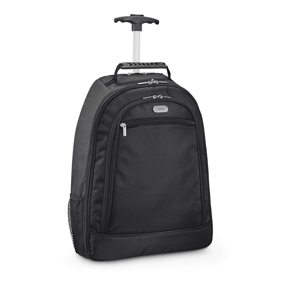 Mochila trolley para notebook em 1680D e 300D com 2 rodas. Possui um compartimento principal almofadado para notebook até 15.6’’, compartimento forrado e diversos bolsos. Bolso frontal com zíper e bolsos laterais em tela mesh. O trolley tem protetor de rodas, alças almofadadas e pega extensível em metal com mola (altura da pega estendida até 530 mm). Placa metálica removível com imã para fácil gravação. Capacidade até 24 L e peso de 1,65 kg. 350 x 460 x 155 mm | Placa: 50 x 20 mm
