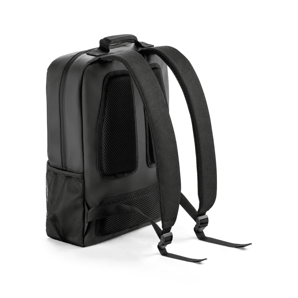 Mochila para notebook em 600D de alta densidade e 600D com revestimento resistente à água. Compartimento principal almofadado com divisória para notebook até 15.6''. Bolso frontal com zíper e dois bolsos laterais em tela mesh. Parte posterior almofadada, com sistema de apoio acolchoado para as costas e alças almofadadas. Capacidade até 10 L. 280 x 400 x 110 mm