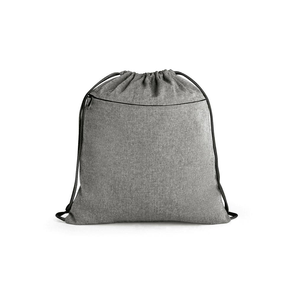 Sacola tipo mochila em 70% algodão reciclado e 30% poliéster reciclado (140 g/m²), com bolso frontal, fecho discreto e alças em algodão. O tecido é sem tingimento, é utilizado na sua cor original, sem produtos químicos de tingimento ou branqueamento, contribuindo para um menor impacto ambiental. 370 x 410 mm