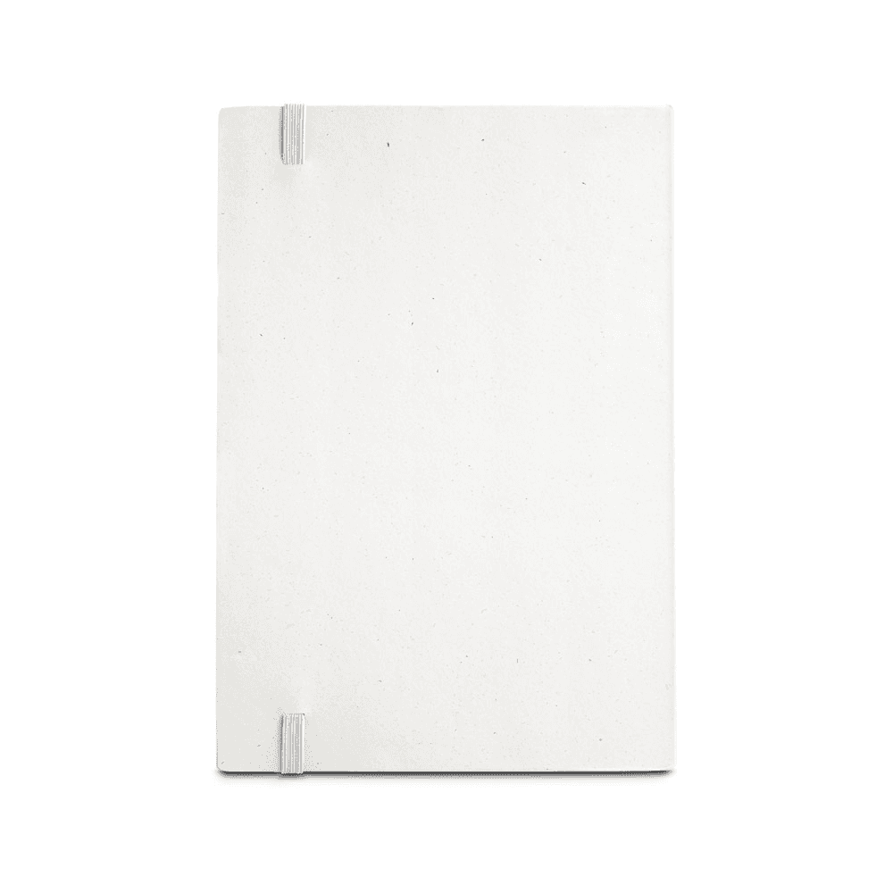 Caderno A5, de capa dura, produzida através de embalagens de leite recicladas, ajudando ao reaproveitamento do cartão e alumínio contido nas embalagens. Contém 160 páginas pautadas cor de marfim, em papel 100% reciclado, fita separadora e elástico para fecho do caderno. 145 x 210 mm