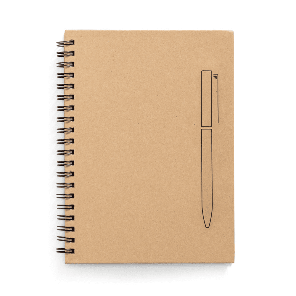 Caderno B6 espiral com capa dura em papel kraft. Contém 140 páginas lisas em papel pedra (120 g/m²) e imã na capa que funciona como um suporte de esferográfica (não inclusa). 130 x 180 mm