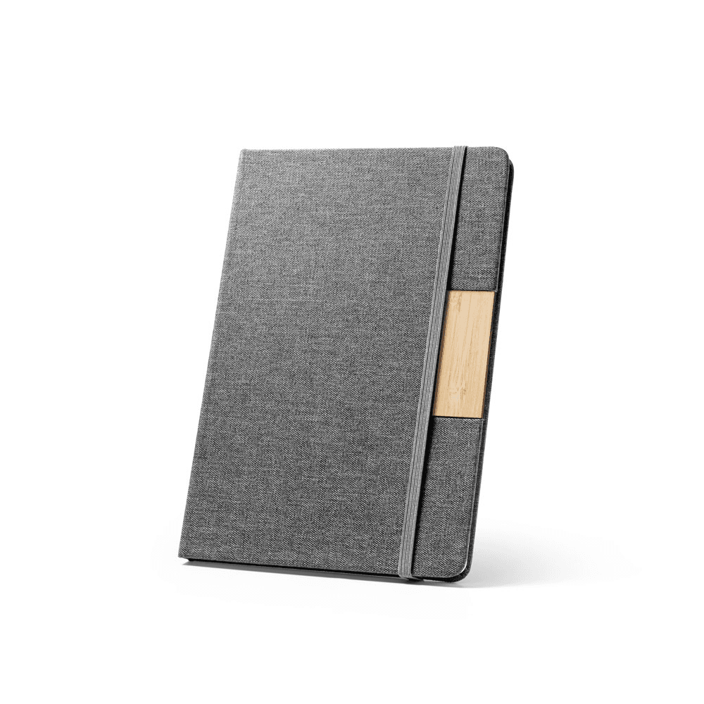Caderno A5 de capa dura em tecido PET 100% reciclado (rPET) e detalhe em bambu. Contém 160 páginas pautadas em papel cor marfim 100% reciclado, fita separadora e elástico para fecho do caderno. A cor e o resultado da impressão nos materiais naturais pode variar entre produtos. A cor e o resultado da impressão nos materiais naturais pode variar entre produtos. 146 x 210 mm