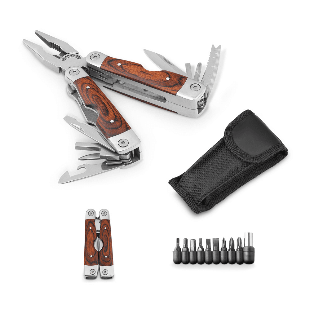 Alicate dobrável multifunções em aço inox e madeira, com 20 funções. Fornecido em bolsa em poliéster. A cor e o resultado da impressão nos materiais naturais pode variar entre produtos. 45 x 100 x 25 mm | Bolsa: 65 x 140 x 30 mm