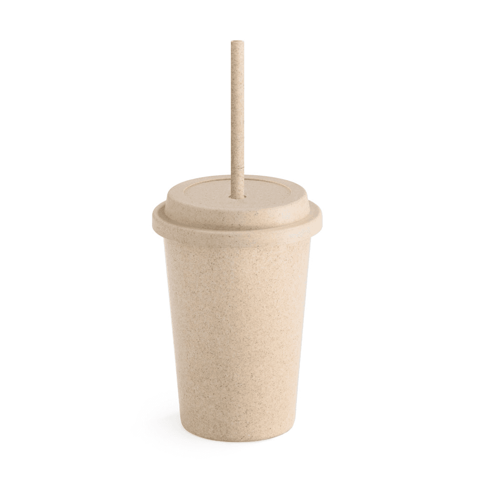 Copo de viagem em fibra de bambu (60%) e PP (40%) com tampa e canudo retráctil. Capacidade até 450 mL. Pode ocorrer transferência de calor. Certificação EU Food Grade. ø93 x 135 mm