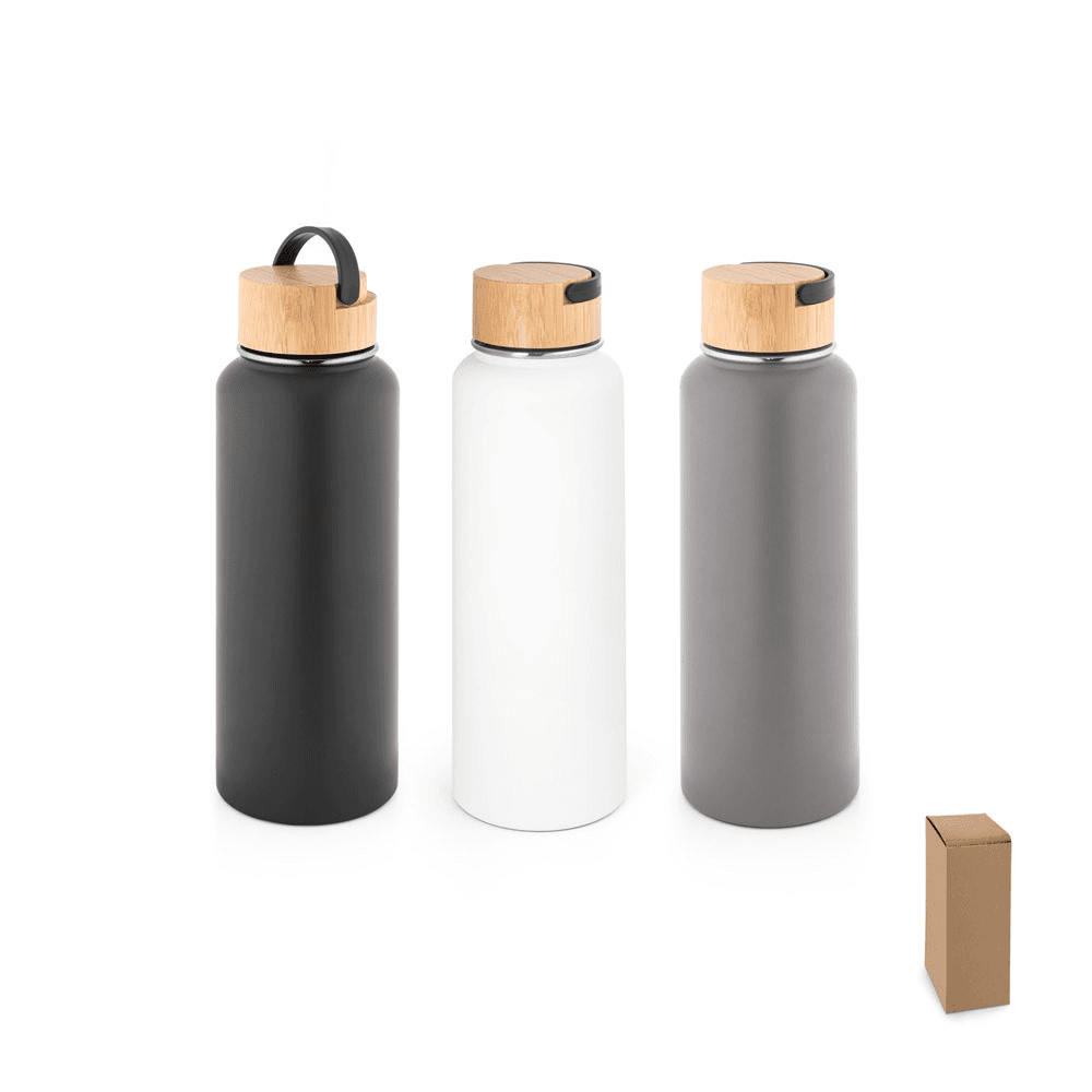 Garrafa em aço inox 90% reciclado de parede dupla térmica, isolada a vácuo. Possui parede com revestimento em pó oferecendo mais durabilidade e resistência. Tampa em bambu com pega em plástico que facilita o transporte. Grande capacidade até 1.2 L. Fornecido em caixa presente de papel kraft reciclado. Certificação EU Food Grade. A cor e o resultado da impressão nos materiais naturais pode variar entre produtos. ø90 x 287 mm
