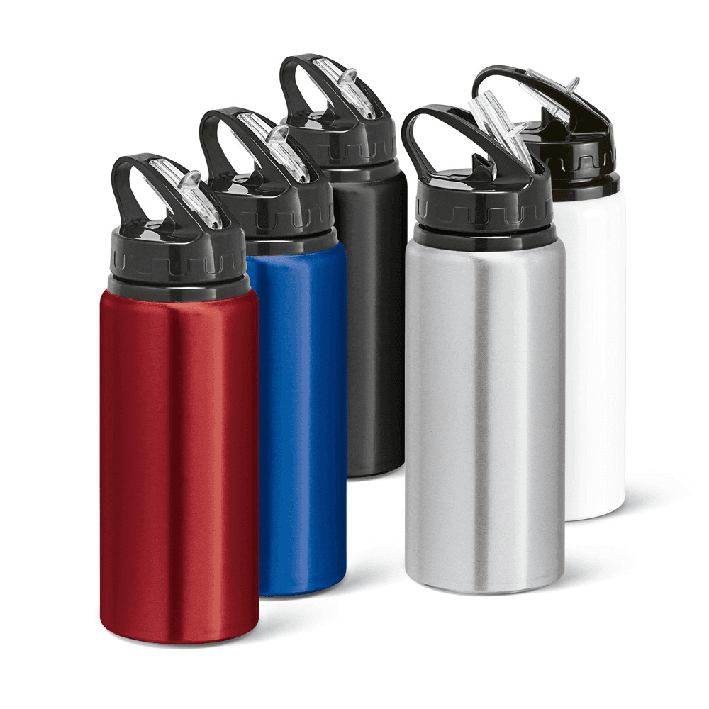 Squeeze em alumínio e tampa PP, com bico de canudo flip e canudo flexível no interior. Capacidade até 670 mL. Caixa branca 94652 vendida opcionalmente. Certificação EU Food Grade. ø73 x 217 mm