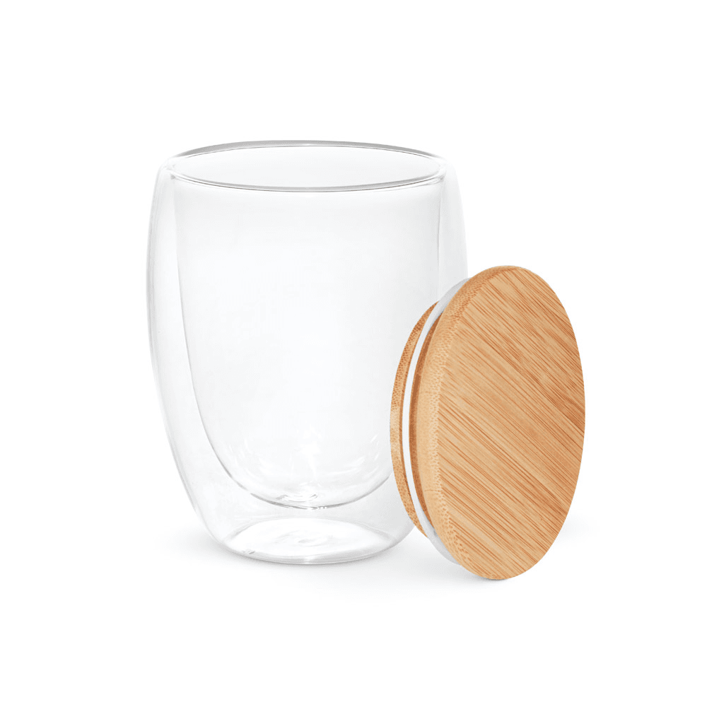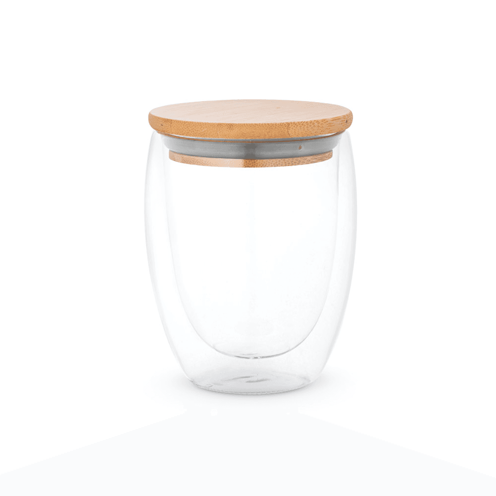 94767 ECUADOR L. Copo em vidro isotérmico (borossilicato), térmico com parede dupla isolada a ar e tampa em bambu 350 mL