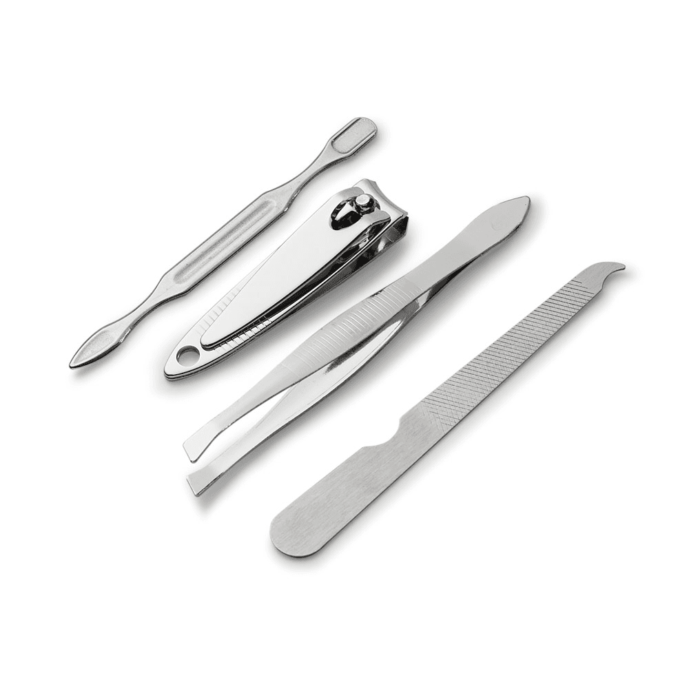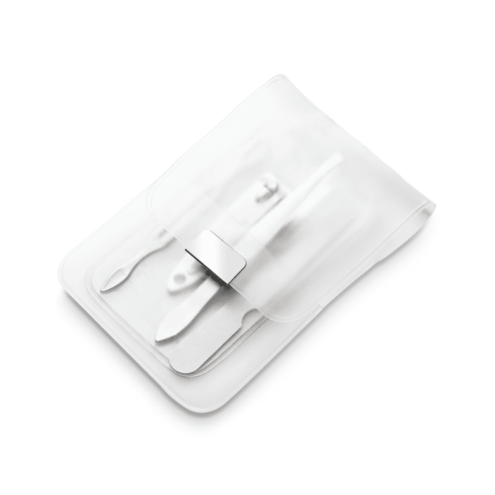 Conjunto de 4 peças para manicure em bolsa de PVC. Composto por lixa, pinça, corta unhas e empurra cutículas. 66 x 105 mm