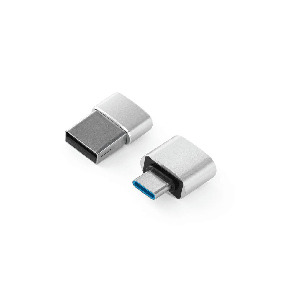 Conjunto de adaptadores em alumínio composto por: 1 adaptador de USB-A para USB-C e 1 adaptador de USB-C para USB-A. Tecnologia USB 2.0. Fornecido em caixa individual em PP. 37 x 40 x 18 mm