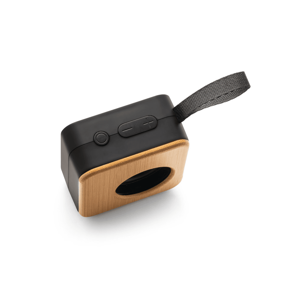 Caixa de som portátil com microfone, em bambu e ABS 100% reciclado, com potência de 3W e transmissão sem fios BT v5.0. Autonomia, aproximada, de 4h e uma bateria de 500 mAh. Fornecido em caixa presente de papel kraft reciclado. A cor e o resultado da impressão nos materiais naturais pode variar entre produtos. 70 x 70 x 37 mm
