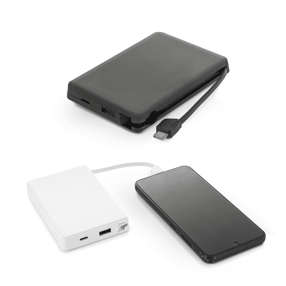 Bateria portátil em ABS 100% reciclado, com cabo integrado. Bateria portátil com capacidade de 10.000 mAh, indicador de nível de carga, uma porta de entrada e saída USB-C, uma porta de saída USB-A e um cabo USB-C integrado, de entrada e saída, para maior comodidade, permitindo carregar de forma prática quer a própria bateria portátil, quer os seus dispositivos móveis. A bateria permite carregar dois dispositivos em simultâneo. Fornecida em caixa presente de papel kraft reciclado. 113 x 73 x 16 mm | Caixa: 75 x 115 x 18 mm