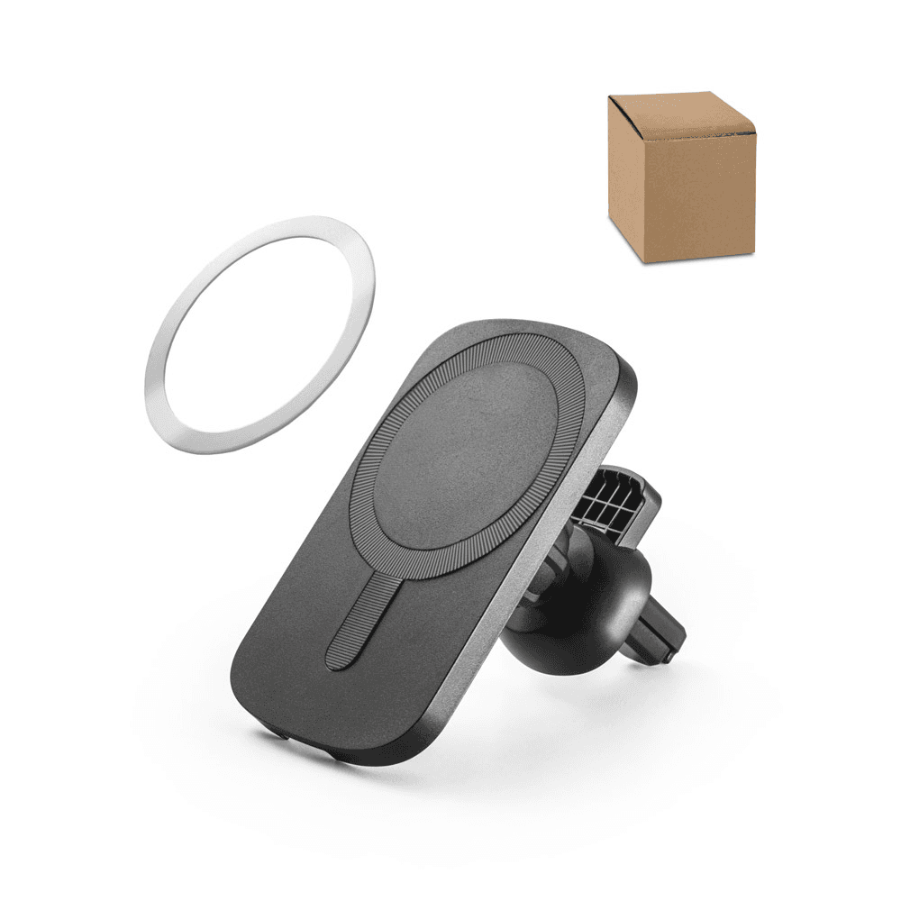 Suporte de carro com carregador magnético por indução (wireless) super-rápido em ABS 100% reciclado e silicone. O clipe permite a fixação na área de ventilação do carro. Possui entrada USB-C e incluso um cabo de carregamento rápido USB-A / USB-C para ligar o carregador com uma potência máxima de 15W. Possui um grip magnético extra para ser colocado nos celulares que não tenham. Compatível com celulares com tecnologia de carregamento sem fios. Ideal para fazer as suas viagens de carro em segurança. Fornecido em caixa presente de papel kraft reciclado. 96 x 59 x 27 mm | Caixa: 72 x 100 x 53 mm