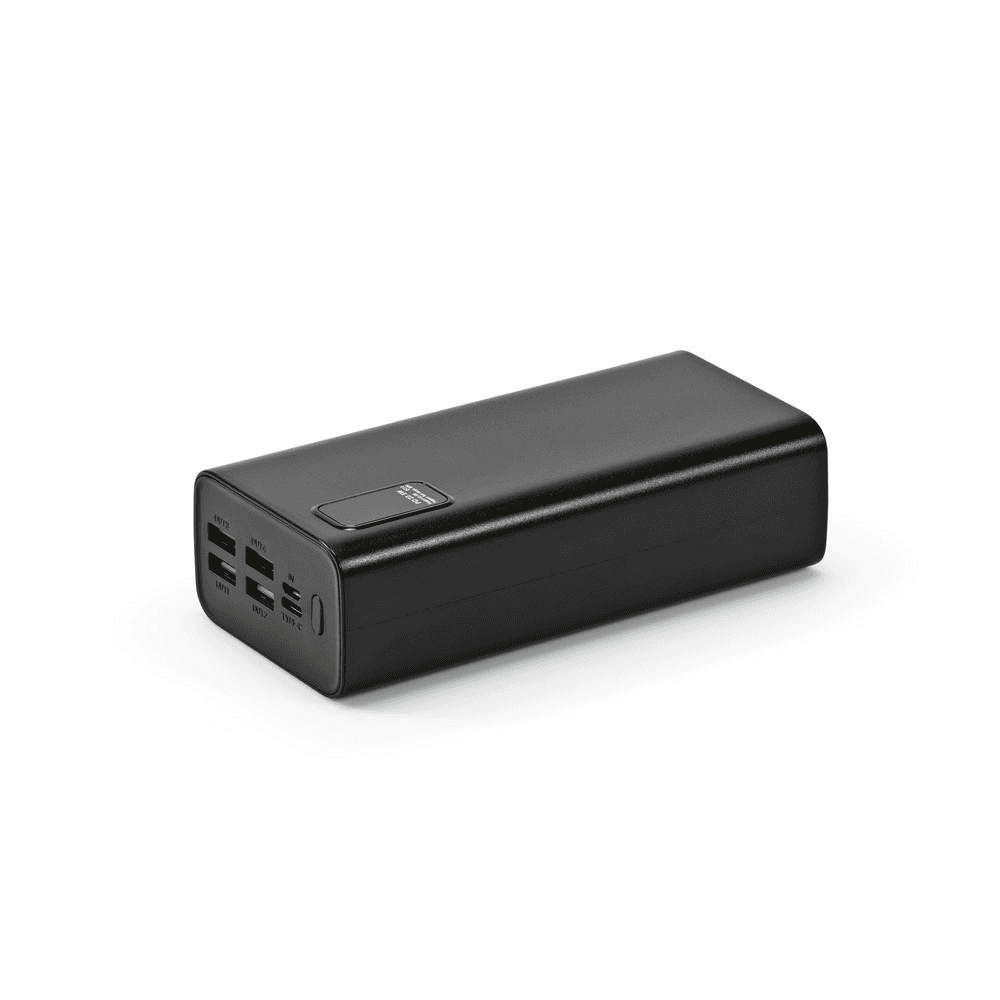 Bateria portátil em ABS 100% reciclado. Bateria em lítio com capacidade de 30.000 mAh e tempo de vida ≥ 300 ciclos. Possui entrada micro-USB e USB-C, 4 saídas USB-A e uma saída USB-C. A parte frontal tem uma tela de LED com informações do nível de carga da bateria. Incluso cabo USB-C para carregamento da bateria. Fornecida em caixa presente de papel kraft reciclado. 143 x 69 x 41 mm | Caixa: 75 x 150 x 45 mm