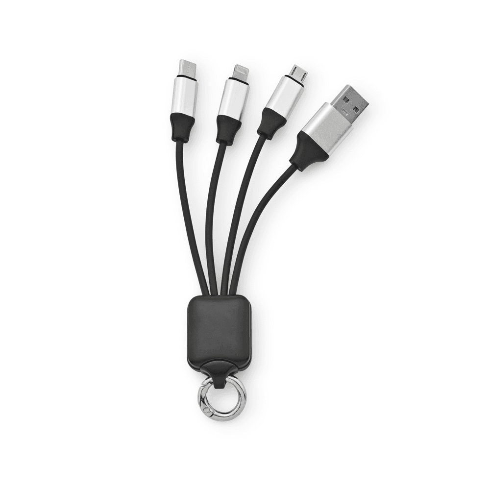 Cabo USB de carregamento rápido 4 em 1 com corpo em PET 100% reciclado. Contém uma porta de USB-A de entrada e uma USB-C, uma micro-USB e uma lightning de saída. Adequado para carregar dispositivos móveis. Fornecido em caixa presente de papel kraft reciclado. 100 x 40 mm | Caixa: 70 x 19 x 165 mm