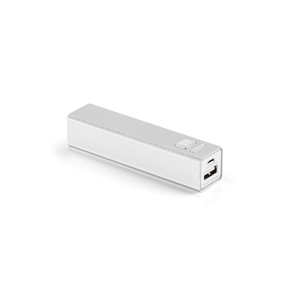 Bateria portátil em alumínio. Bateria de lítio com capacidade de 1.800 mAh, tempo de vida ≥ 500 ciclos e porta de saída USB-A. Incluso cabo USB para carregar a bateria. 95 x 23 x 22 mm