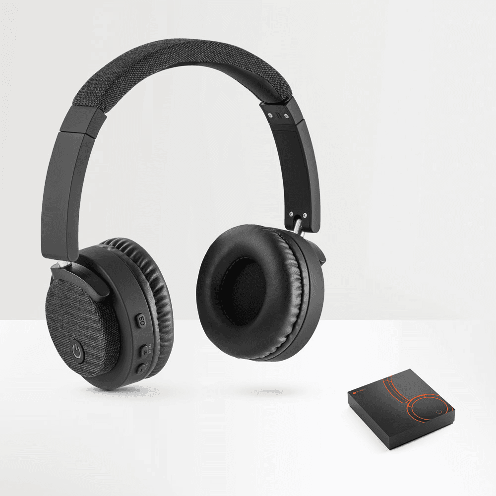 Fones de ouvido sem fios em ABS e tecido com ligação BT 5.0. O acabamento destaca-se por ser emborrachado, completado com detalhes em tecido. Ideais para complementar qualquer estilo e ouvir música sem parar, graças às 16h de autonomia e tempo de carregamento de 3h. Incluso, ainda, função mãos livres e microfone. A potência é de 32Ω e a frequência 20Hz-20kHz. Fornecidos em caixa presente preta com cabo de carregamento USB/micro USB. 95 x 155 x 52 mm | Caixa: 209 x 224 x 52 mm