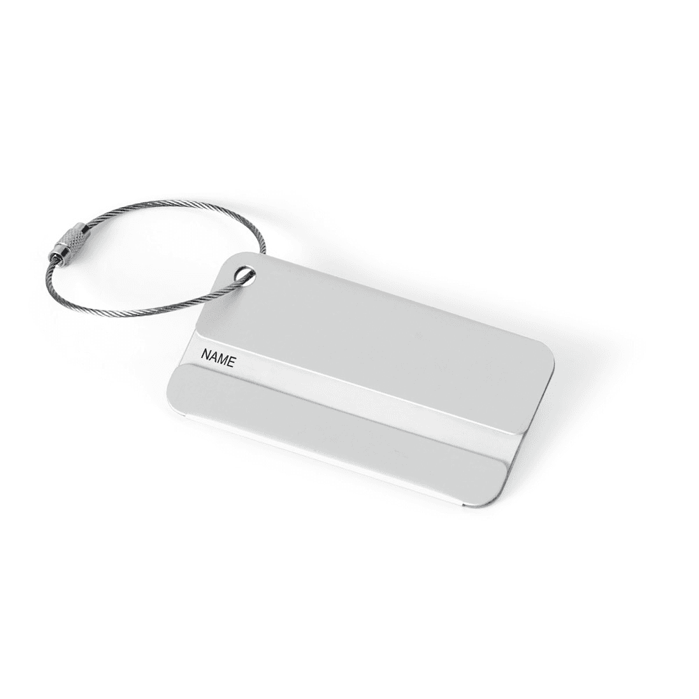 Identificador de bagagem em alumínio com cordão. Ideal para malas de viagem. 80 x 42 x 2 mm