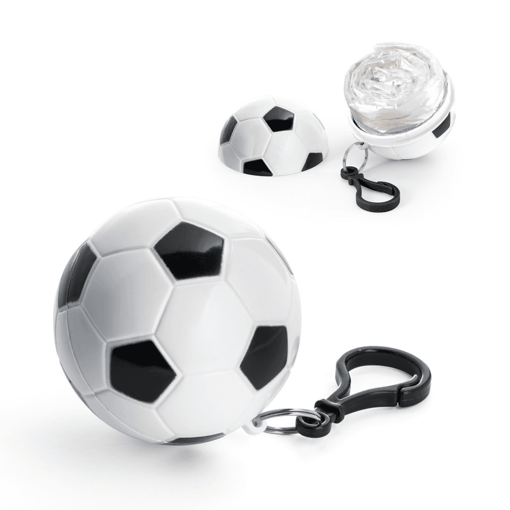 Capa de chuva de tamanho único fornecida dentro de embalagem em formato de bola de futebol, com chaveiro e mosquetão. ø63 mm | 1200 x 900 mm
