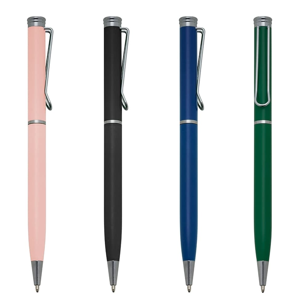 Caneta metálica com carga esferográfica azul 1.0 mm e acionamento por rotação.