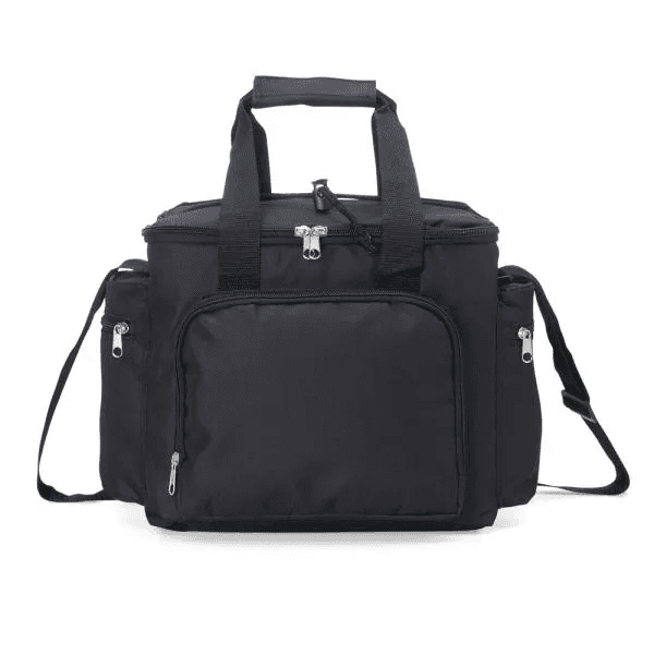 Bolsa Térmica preta em Polyester 600D, 300D e PEVA. Conta com alças de mão, alça de ombro, bolso frontal com zíper, dois bolsos laterais com zíper, elástico superior trançado. Forro interno branco soldado (não vaza) feito de PEVA, atóxico e mais sustentável que o PVC. Tempo de Conservação aproximado: Frio 10 horas / Quente 3 horas.