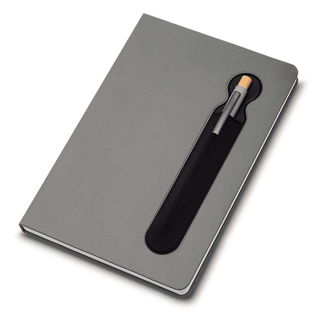 Caderno de anotações com suporte para caneta, capa dura em PU, miolo 80 folhas pautadas na cor bege. NÃO ACOMPANHA CANETA.
