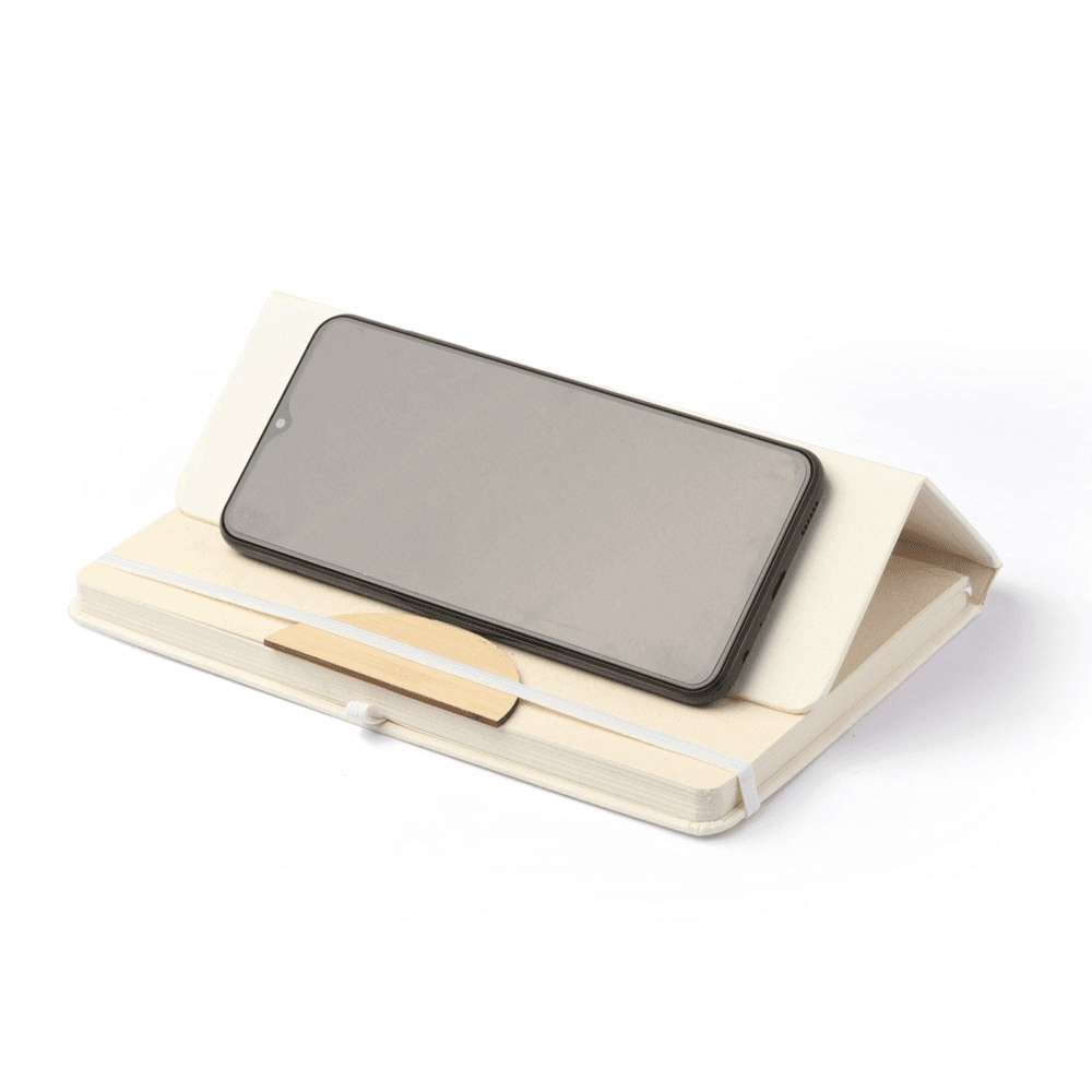 Caderno com tampa de função de suporte para smartphone. Produzido com caixa de leite, possui guarnições em bambu, porta canetas e elástico branco com 80 folhas (g/m2) pautadas na cor bege.