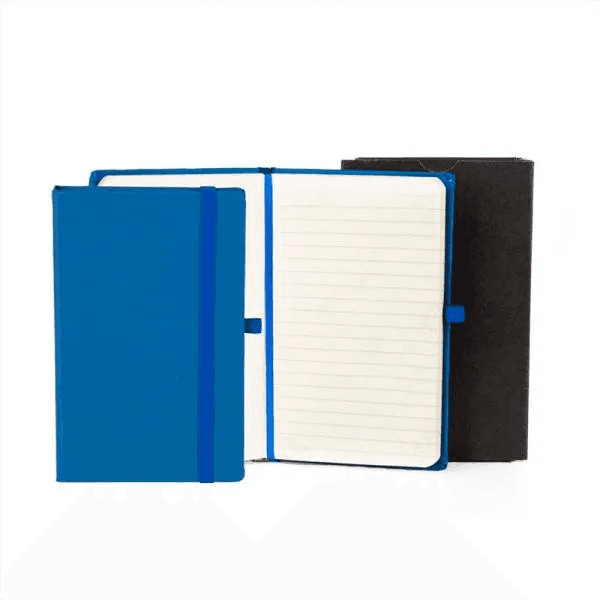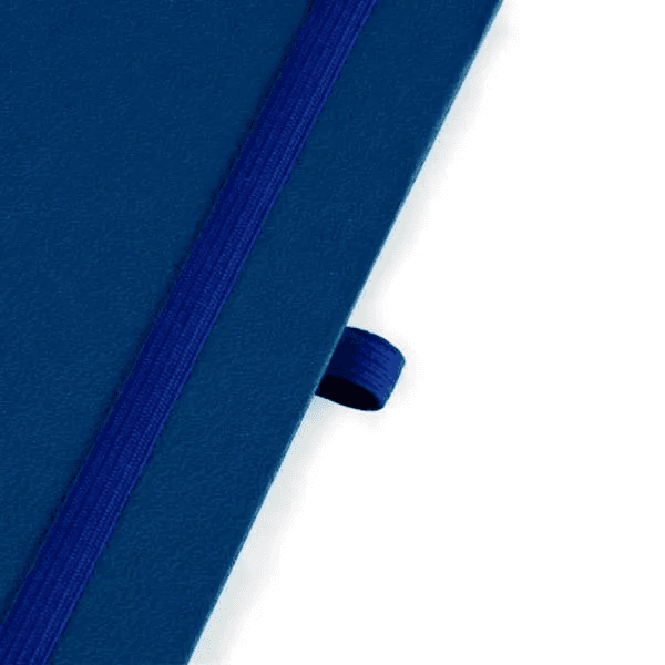 Caderno para anotações azul com capa dura. Conta com 80 folhas pautadas, marcador de página, porta caneta e elástico para fechamento. Gramatura da folha de 70 g/m2.