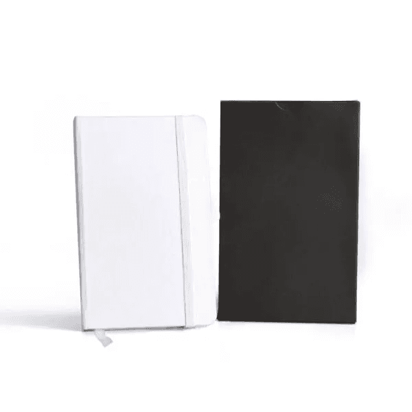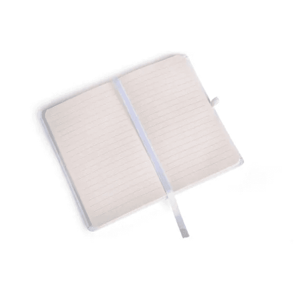 Caderno para anotações branco com capa dura. Conta com 80 folhas pautadas, marcador de página, porta caneta e elástico para fechamento. Gramatura da folha de 70 g/m2.