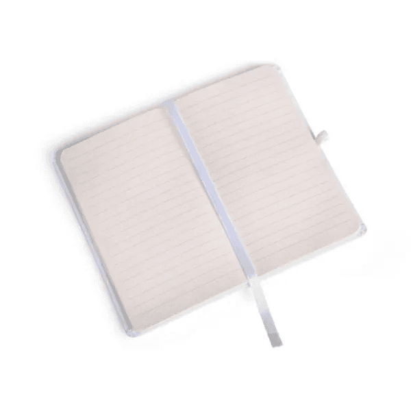 Caderno para anotações branco com capa dura. Conta com 80 folhas pautadas, marcador de página, porta caneta e elástico para fechamento. Gramatura da folha de 70 g/m2.