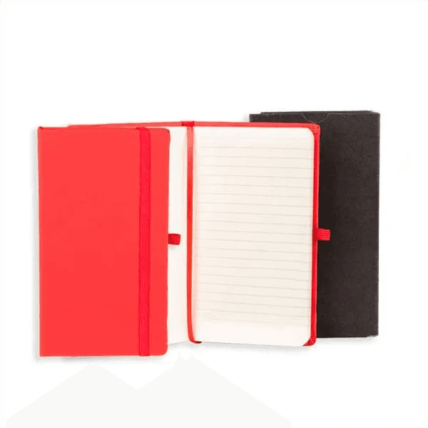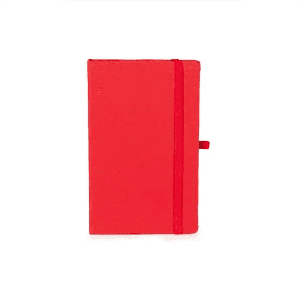 Caderno para anotações vermelho com capa dura. Conta com 80 folhas pautadas, marcador de página, porta caneta e elástico para fechamento. Gramatura da folha de 70 g/m2.