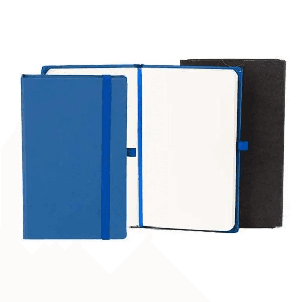 Caderno para anotações azul com capa dura. Conta com 80 folhas não pautadas, marcador de página, porta caneta e elástico para fechamento. Gramatura da folha de 70 g/m2.