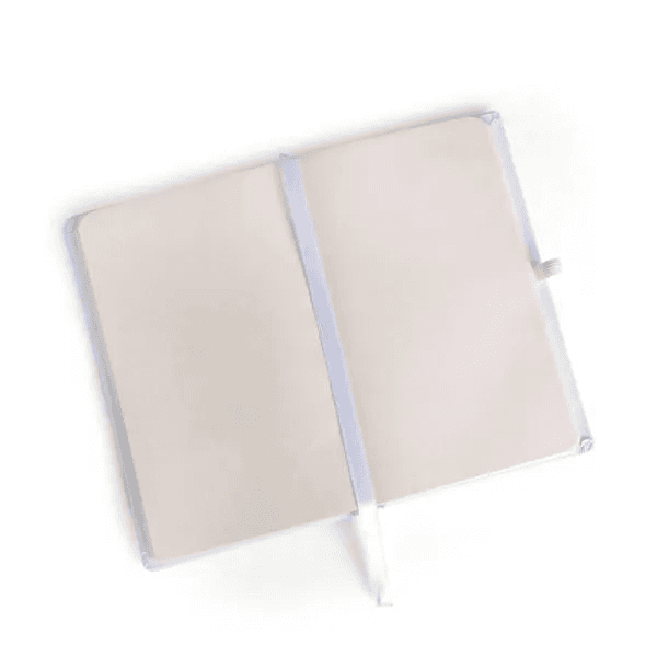 Caderno para anotações branco com capa dura. Conta com 80 folhas não pautadas, marcador de página, porta caneta e elástico para fechamento. Gramatura da folha de 70 g/m2.
