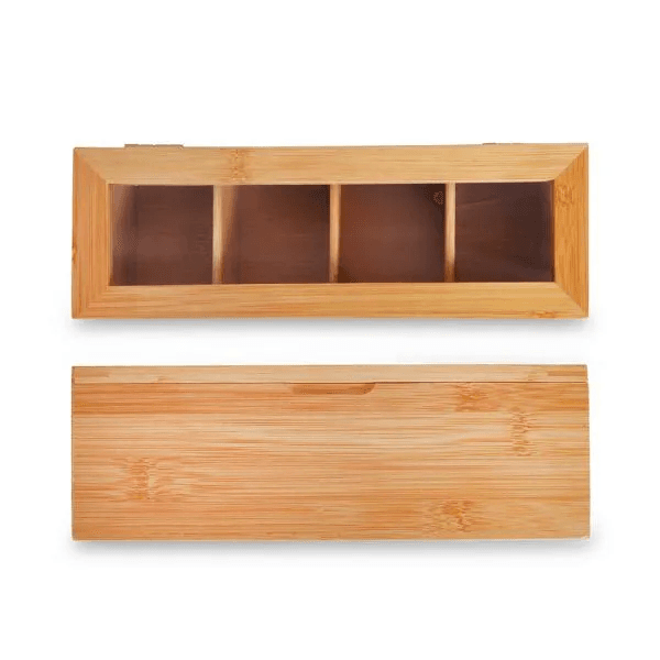 Caixa para chás em Bambu/Poliestireno. Possui 4 divisões, tampa com visor em Poliestireno e fecho com imã. Não acompanha chás.
