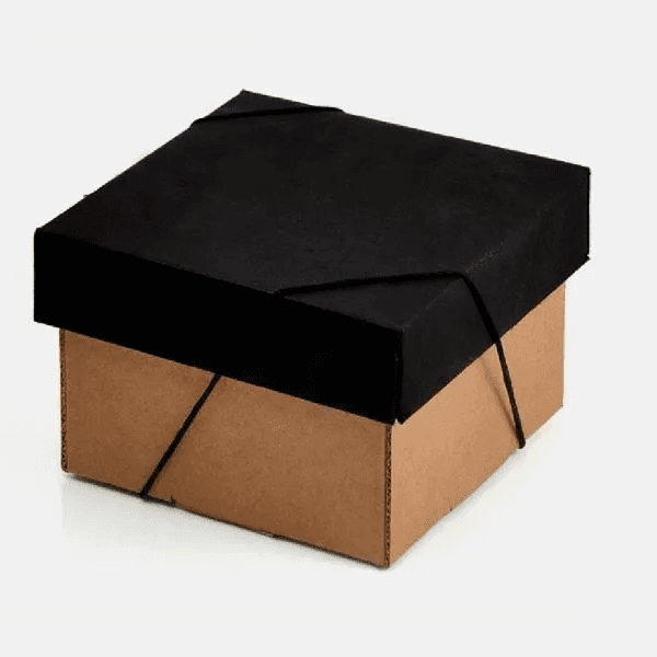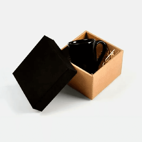Caneca em cerâmica preta com capacidade para até 230 ml e uma embalagem com elástico para presente.