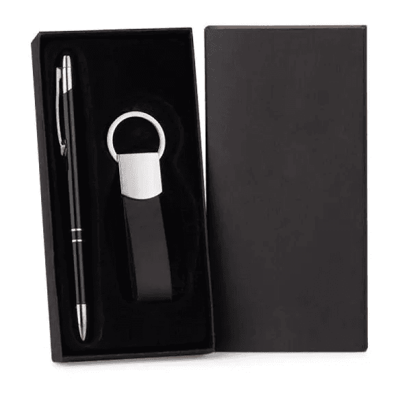 Caneta e chaveiro em metal. Composto por caneta esferográfica em alumínio preto e chaveiro em metal e material sintético preto.
