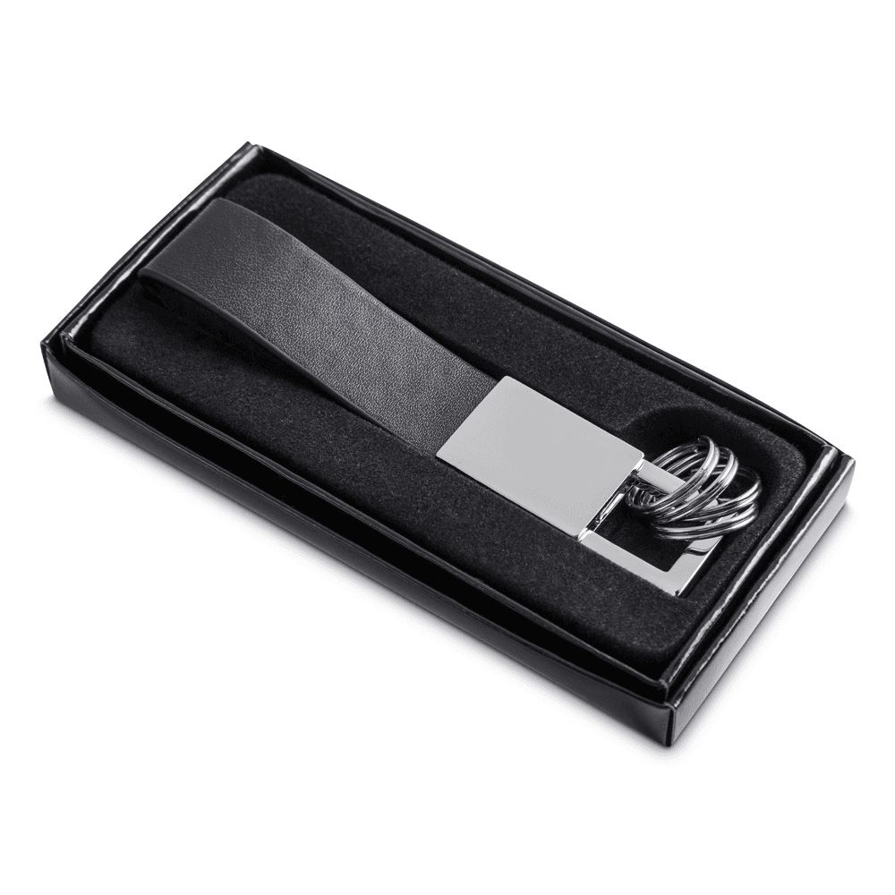 Chaveiro com alça de couro sintético e parte de metal com 4 argolas para chave + caixa com berço aveludado