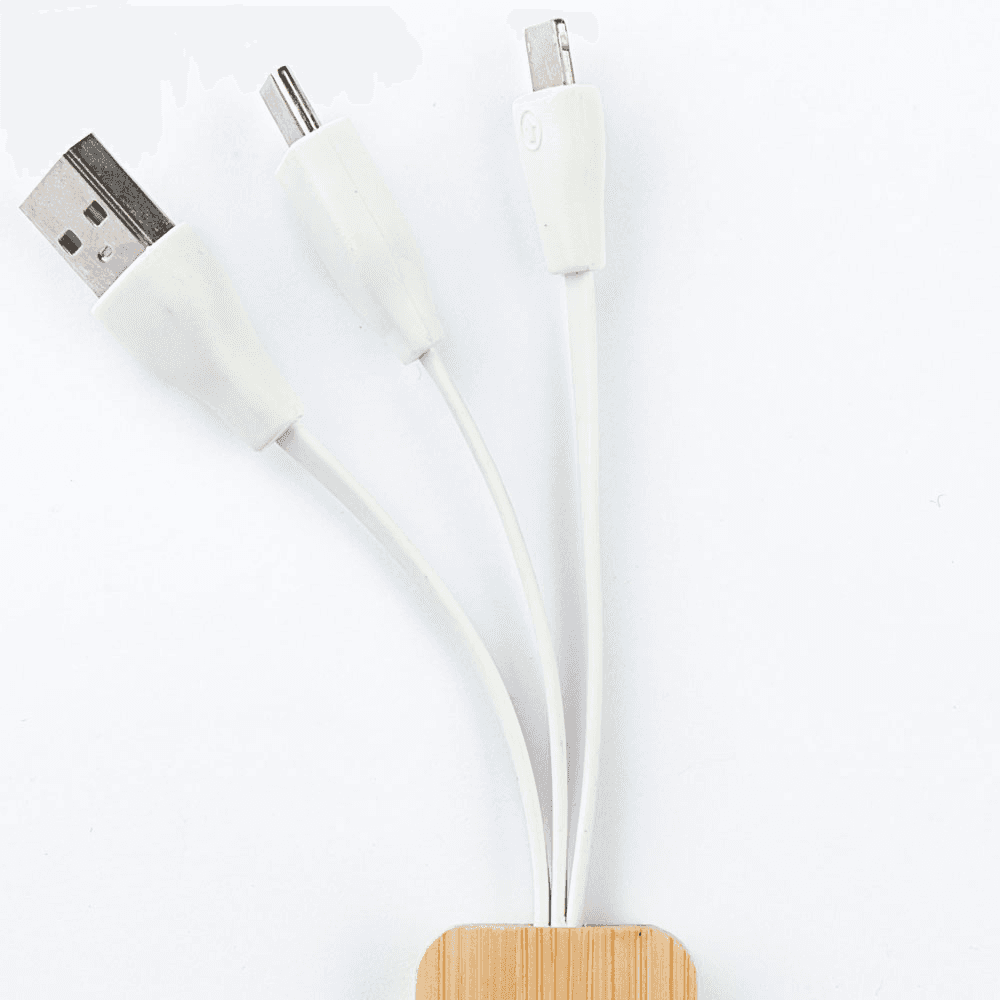 Chaveiro em bambu com cabo para carregamento USB-A a lightning (Iphone) e Tipo C. Como o bambu é um material natural, a cor do item pode variar.