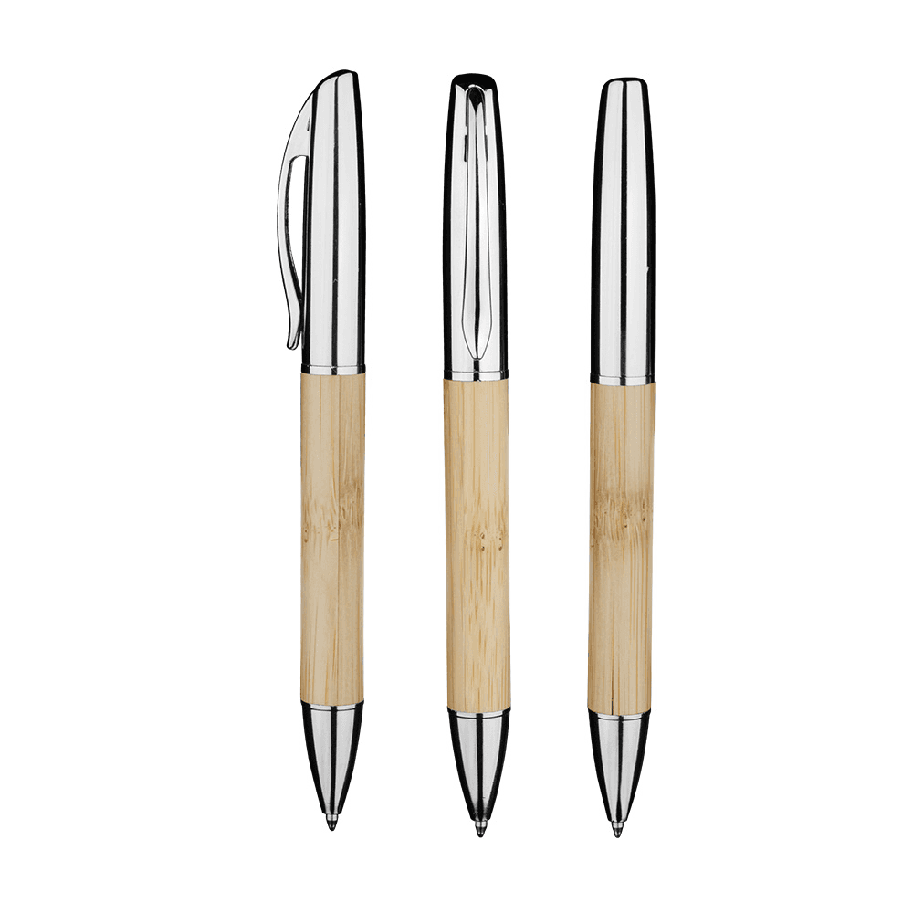 Caneta corpo de bambu com detalhes em metal.